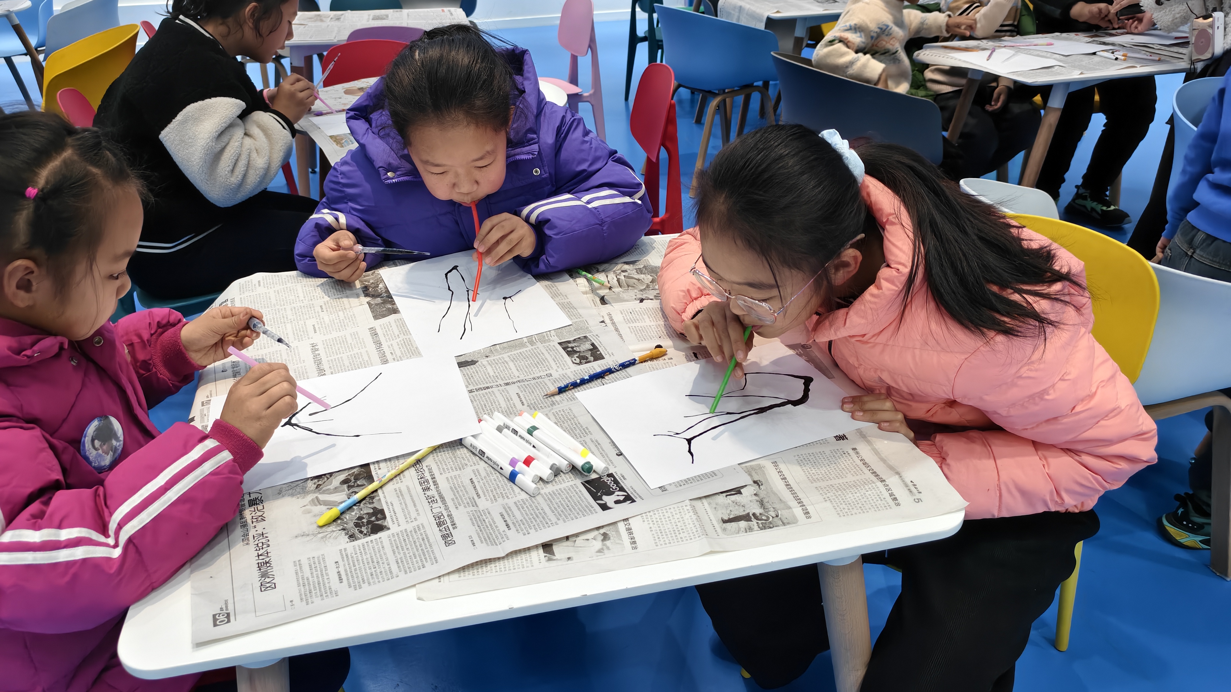 在“梅花画九”动手体验环节,科普辅导员为大家讲解“画九”习俗的由来:古代先民以冬至为计时起点,绘制九朵梅花,每日涂染一朵花瓣,待九九八十一天画满,便迎来春暖花开。这一习俗既寄托着人们对春日的殷切期盼,也是古人观测气候、感知时节变迁的独特智慧结晶。现场亲子家庭依次领取了空白梅花画纸与彩色画笔,家长与孩子默契配合、尽情挥洒创意。大家或为梅花点缀冬日雪景,或融入饺子、灯笼等冬至元素,一幅幅作品生动鲜活,尽显传统文化的深厚底蕴。