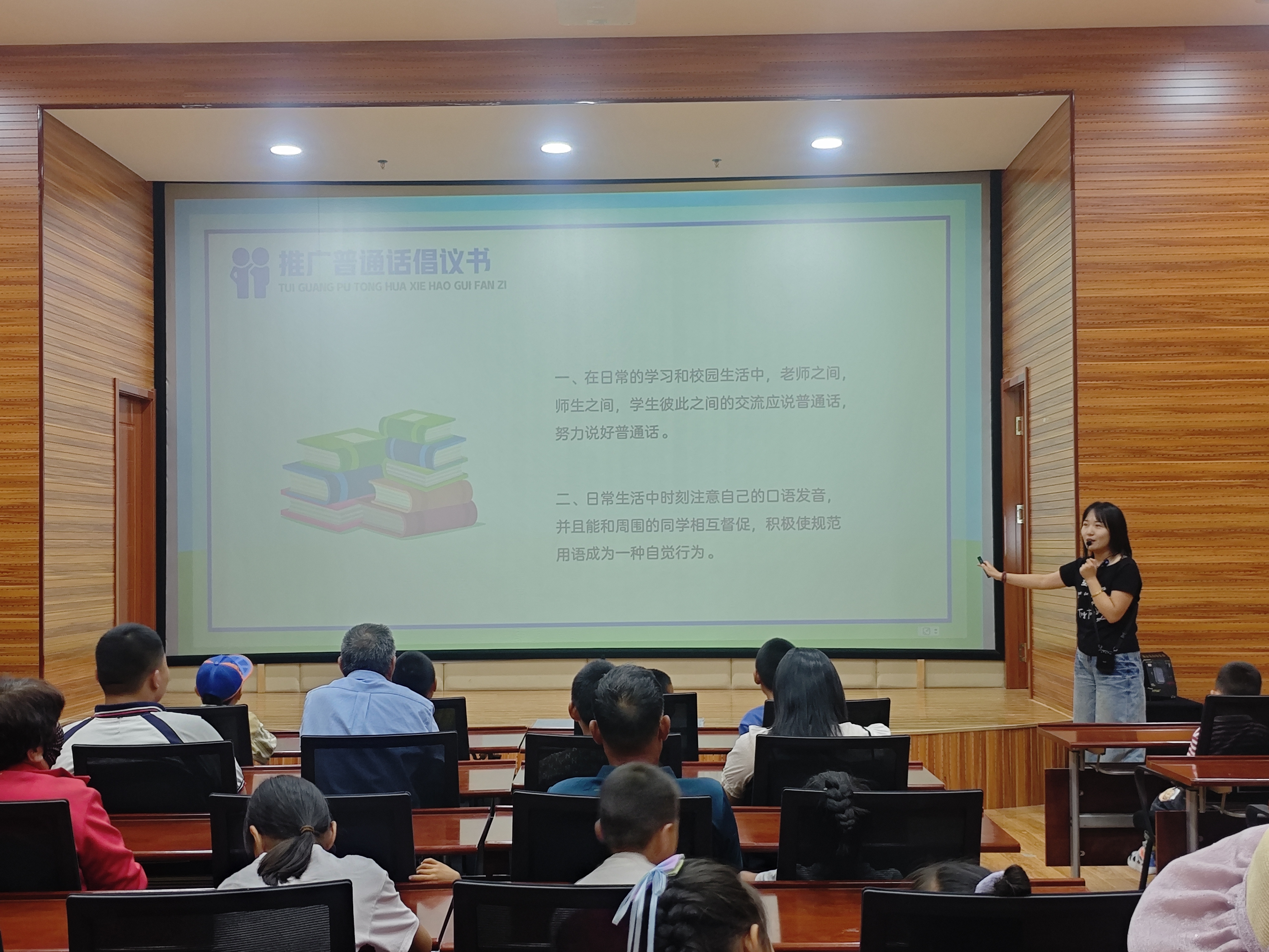 展教员组织家长与小朋友共同观看推普宣传视频,让孩子们了解语言规范的重要性和推普周的由来与发展,并阐释普通话作为国家通用语言的重要意义。为增强理解,现场还特别设置“方言小课堂”——邀请小朋友尝试用方言表达同一句话,在趣味对比中直观感受普通话在沟通上的便利性与通用性,通过活动理解说普通话的重要性。