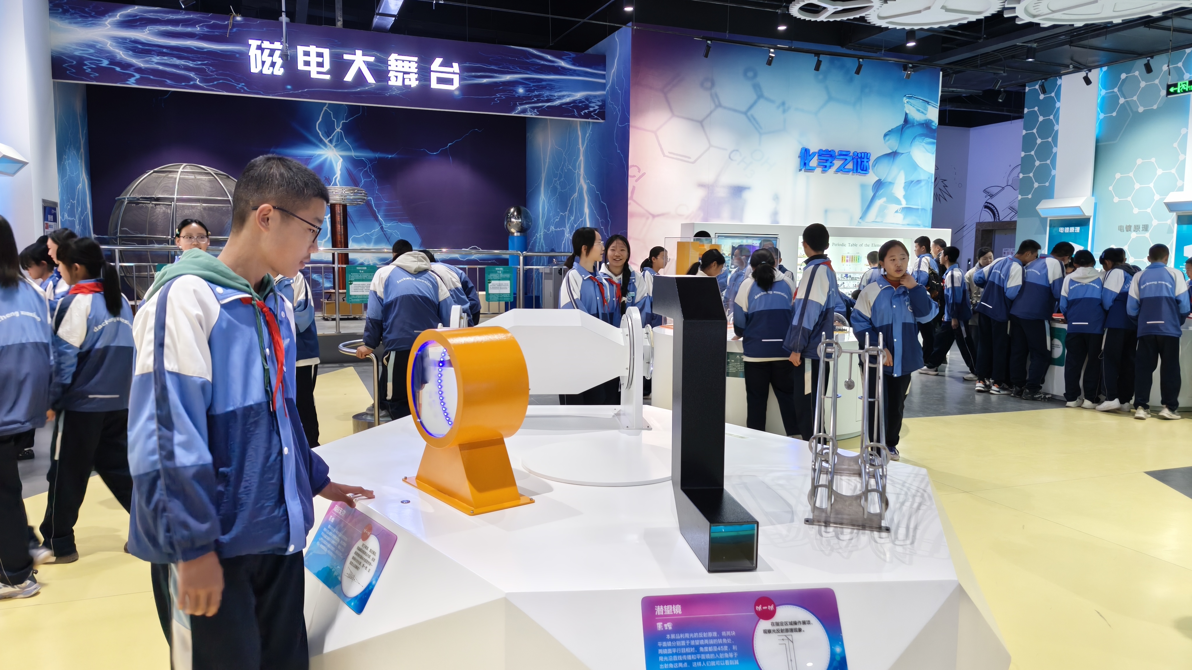 在基础科学展厅,一系列直观有趣的展品瞬间点燃同学们的热情,他们围绕在“声光体验”和“电磁探秘”展区,亲手操作辉光球,观察光线在静电作用下的奇妙路径;在彩色的影子展品前,探寻光的三原色混合奥秘。这些将课本知识具象化的互动装置,让抽象的物理定律变得可视、可触、可感,在阵阵惊叹与欢声笑语中,科学的种子已悄然播撒在心田。