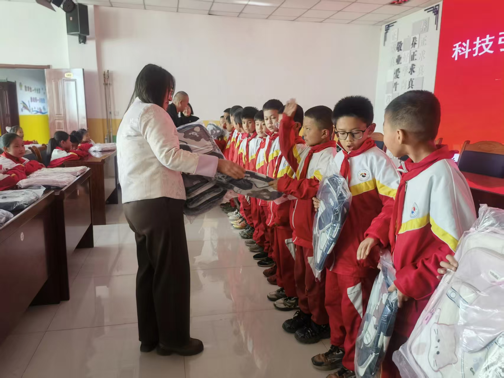 随后的爱心捐赠仪式上,一个个整齐摆放的崭新书包传递的不仅是承载文具的实用物品,更是对青少年科学梦想的温柔托举与精准赋能。三立小学校长代表全校师生表达感谢:“这批书包不仅实用,更充满了对孩子们的期许。每一个科学图案、每一处贴心设计,都能让孩子们感受到科技的温度,鼓励孩子们努力学习,在科学探索的道路上勇毅前行。”