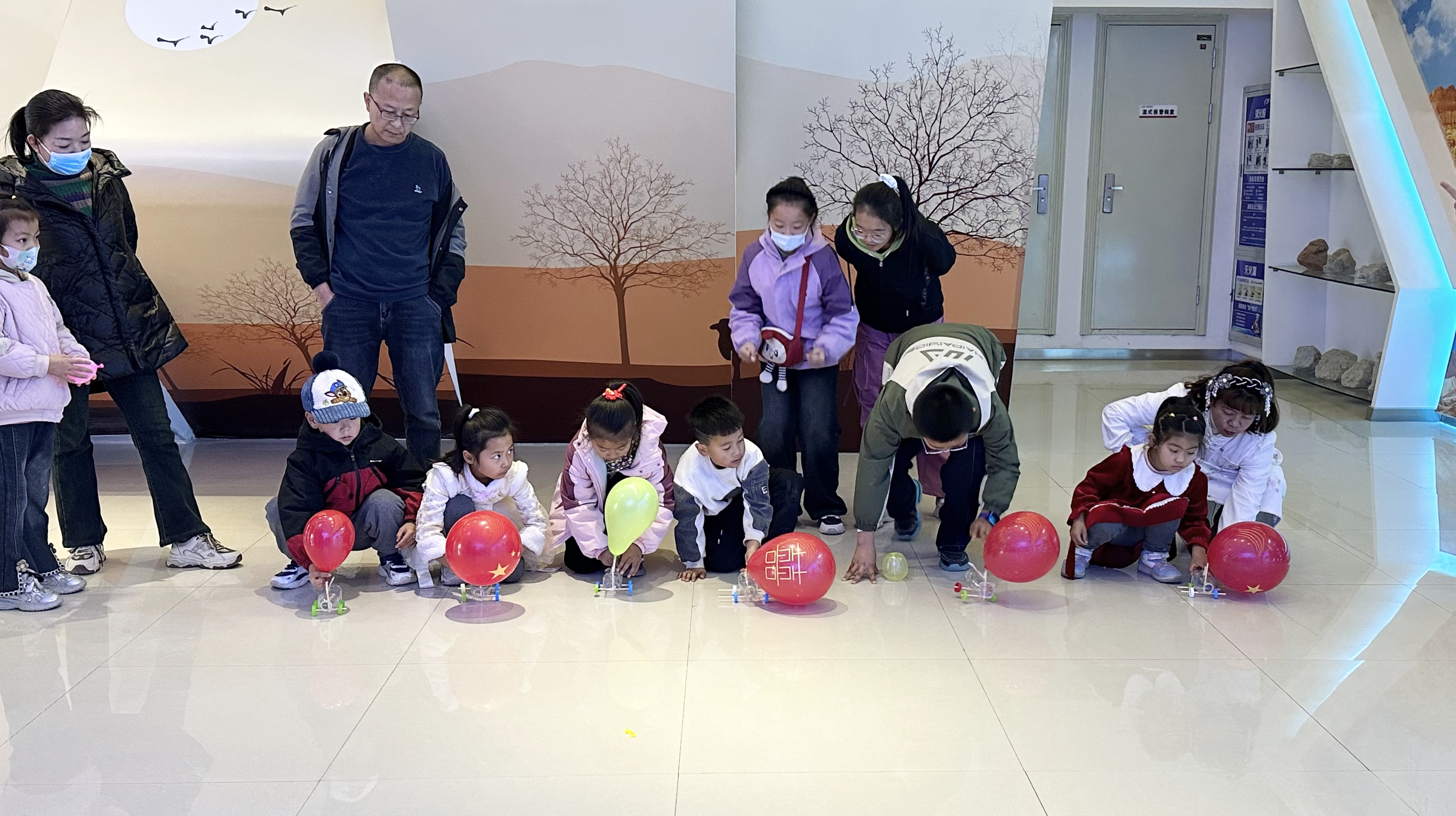 创意制作环节,孩子们在家长协助与辅导员指导下,利用废旧矿泉水瓶、瓶盖等材料,将废弃物组装成造型各异的气球动力小车。制作完成后,“小车竞速赛”如期举行,孩子们调试气球充气量与小车方向,小车借气体反作用力冲刺,现场氛围热烈,大家在竞争中感受创造乐趣与科学魅力。“生活中的空气魔法”环节中,辅导员结合高铁尖头、飞机机翼等实例,讲解空气动力学在生活中的应用,让孩子们切实体会“科学就在身边”。