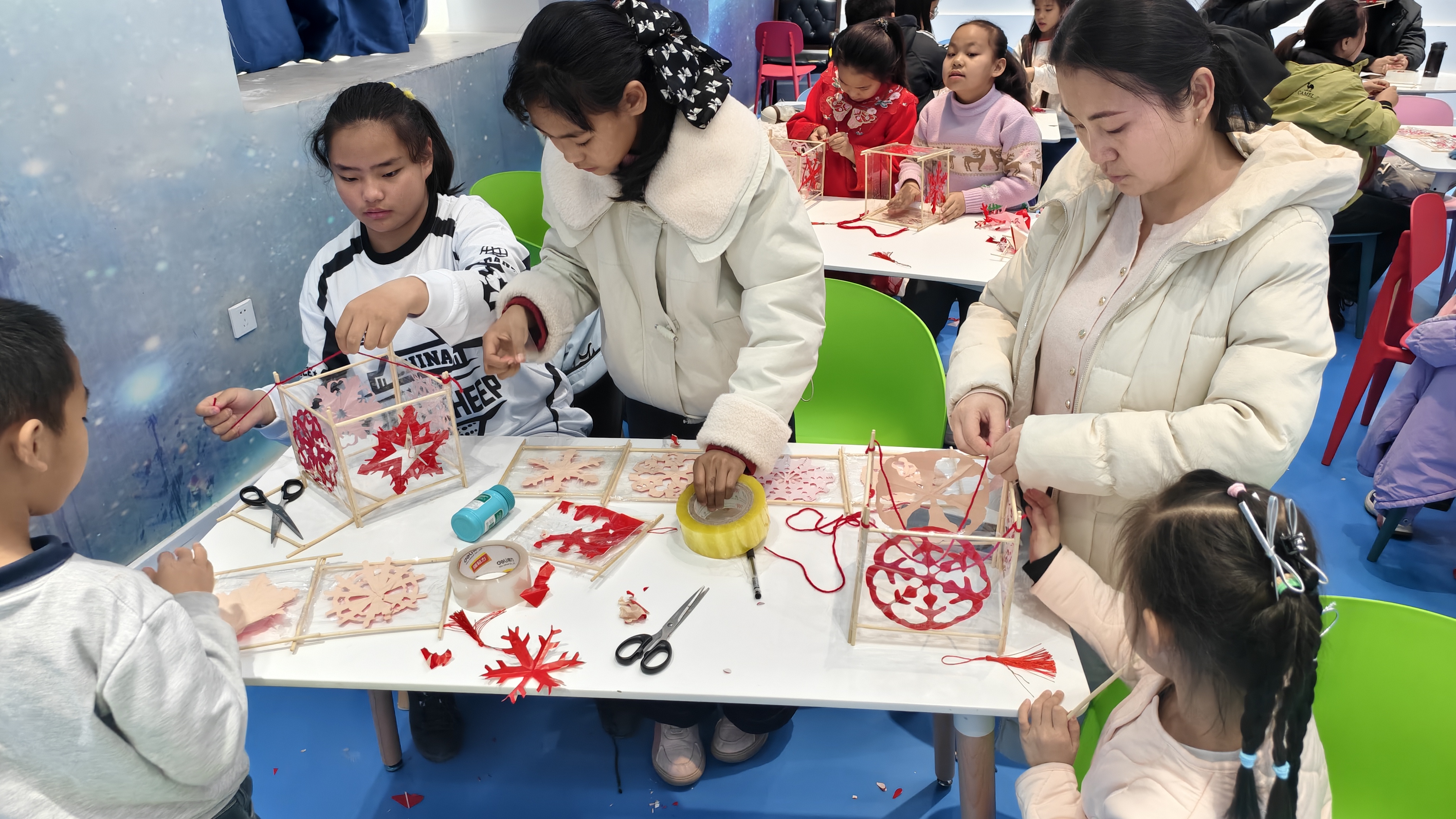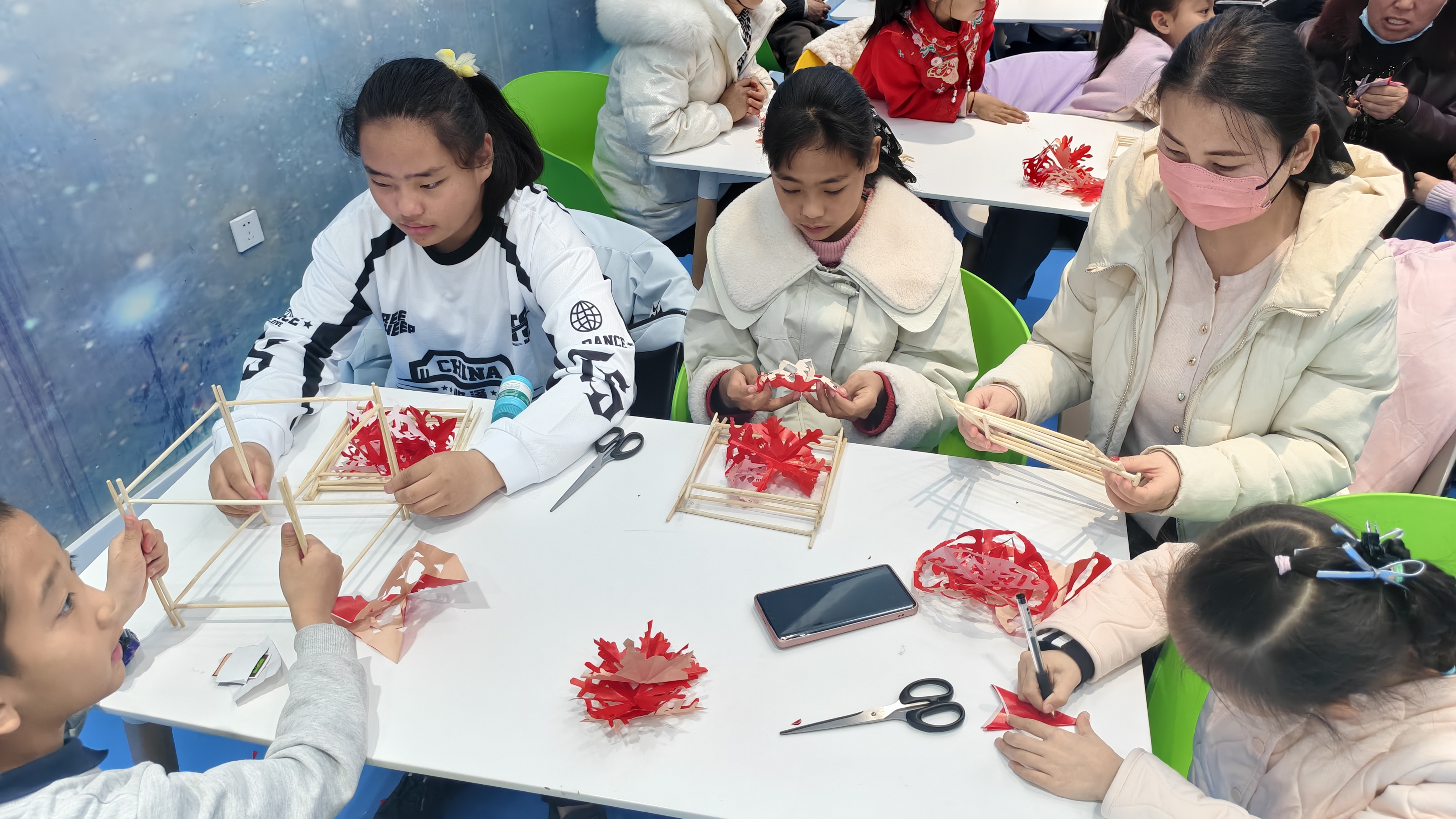 动手体验环节,辅导员现场示范折纸、画样、裁剪的核心技巧,从对称折法到纹样设计,手把手教孩子们剪纸制作。大家手持剪刀,小心翼翼地裁剪红纸,原本普通的红纸在指尖蜕变成一幅幅精美的剪纸作品。随后大家将裁剪好的剪纸作品、灯笼框架等材料粘贴、组装,将传统剪纸与灯笼制作完美融合。当一盏盏承载着团圆吉祥寓意的剪纸灯笼组装完成,现场洋溢着满满的成就感与文化氛围。