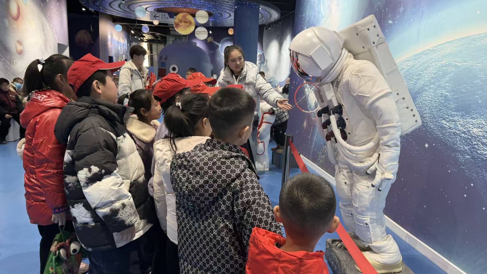 随后,孩子们来到“宇宙探秘”展区,航天服模型前围满好奇的身影。科技馆老师拿起模型手套讲解道:“这层防滑纹理能让航天员在太空抓稳仪器,关节处的特殊设计还能灵活的活动。”孩子们伸手触摸银色外层的防辐射材质,模仿航天员“太空行走”的姿势,沉浸式感受航天科技的魅力。现场观摩体验让孩子们在动手体验中理解电磁原理,实践学习加之课本知识,让孩子们能够记忆深刻,也在探索宇宙中种下航天梦想,让科学的种子在孩子们心中扎根。