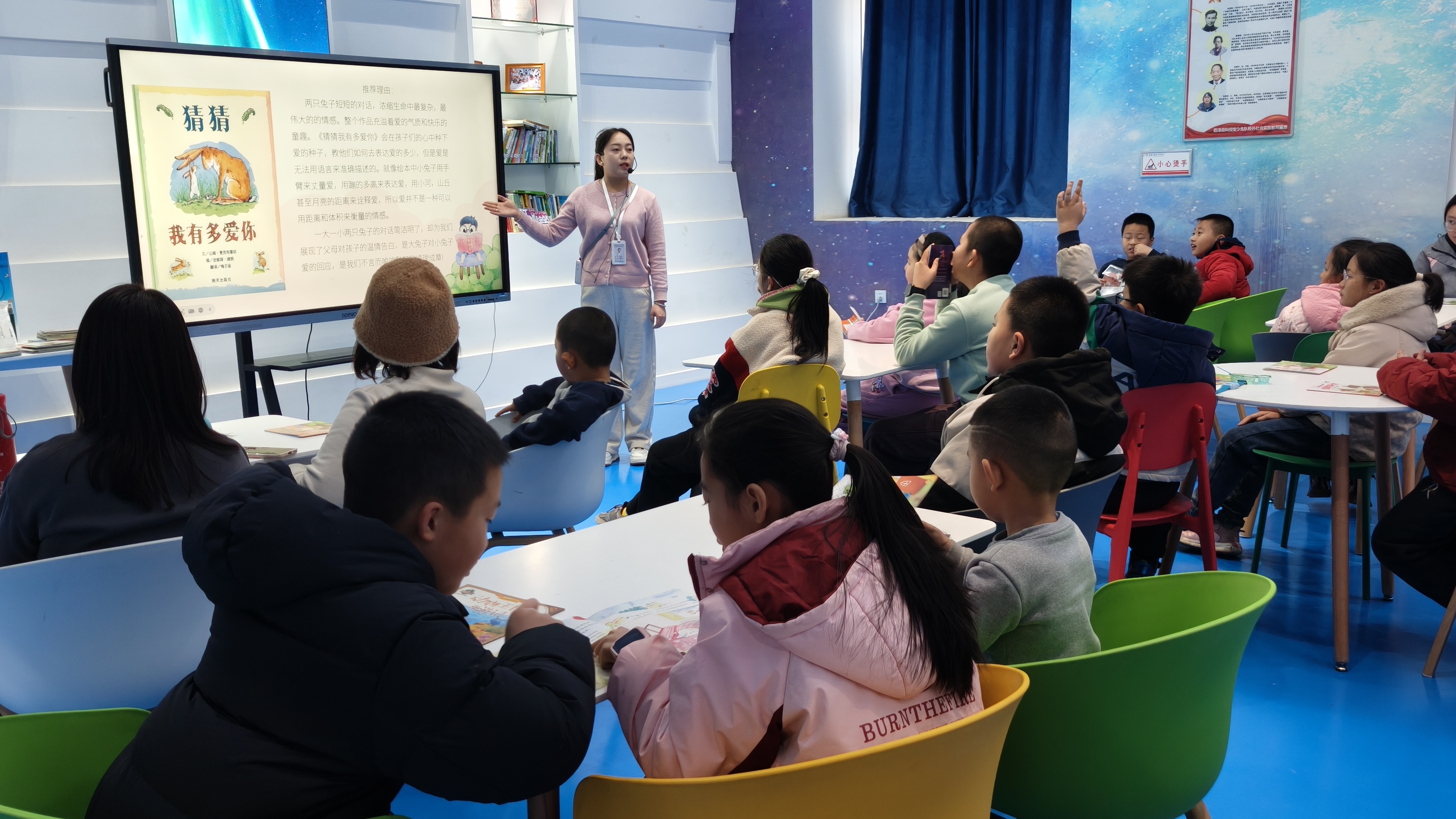 活动伊始,科普辅导员以经典绘本《猜猜我有多爱你》为切入点,用生动的语调讲述兔宝宝与兔妈妈互诉爱意的温馨故事。孩子们跟着辅导员模仿书中动作,伸开双臂丈量“爱的宽度”,踮起脚尖比拼“爱的高度”,在趣味互动中,辅导员引导孩子们感受亲情的美好与爱的表达艺术,在童真互动中深刻理解亲情的珍贵与爱的多元表达,让爱的种子在心中生根发芽。